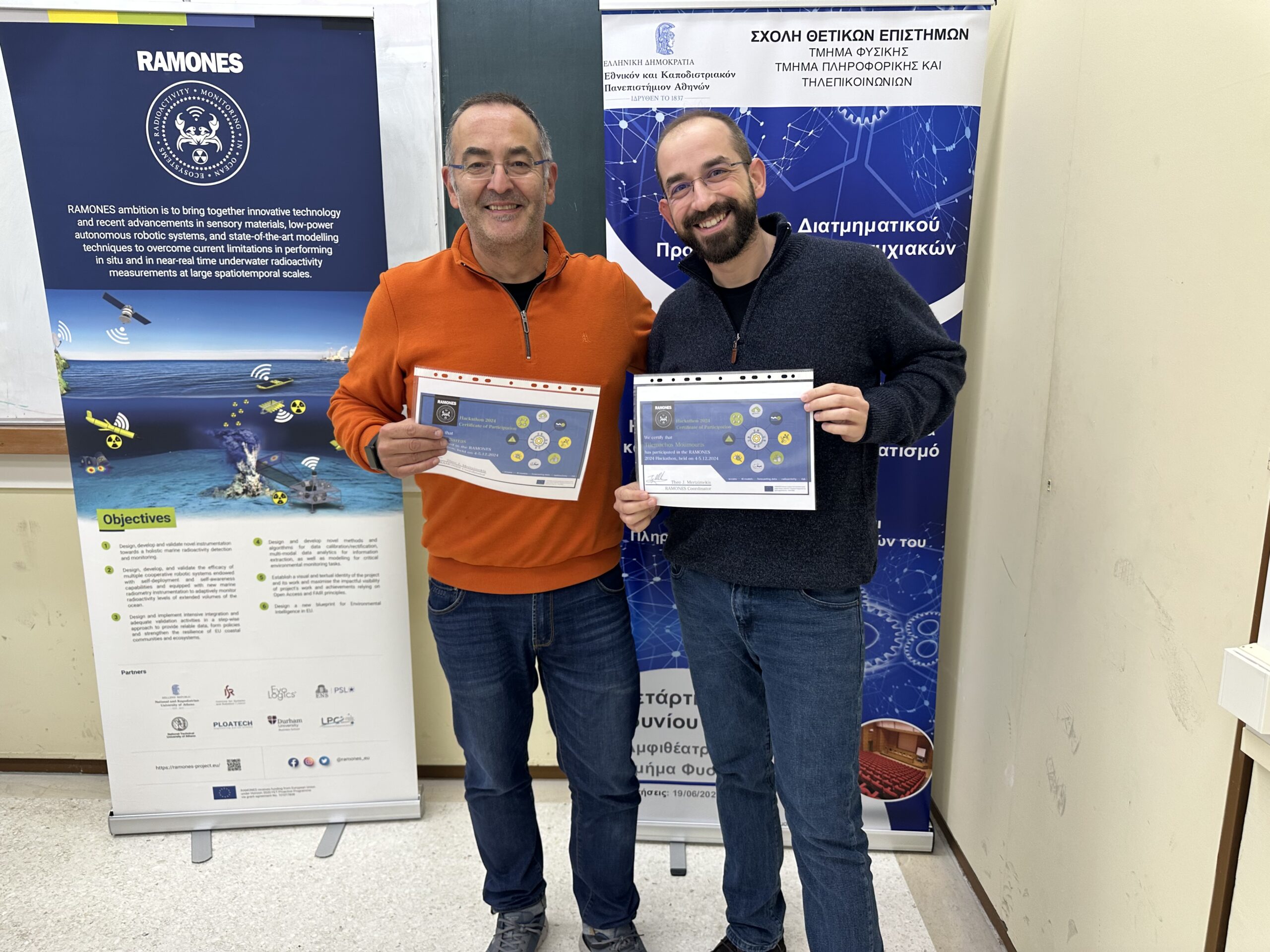 The RAMONES Hackathon at the NKUA Department of Physics on 5-12-24 was a huge success! The four competing teams comprised of students and young researchers excelled in various thematic areas, giving their best and creating very interesting presentations related to the challenges: Visualizing marine radioactivity data at a global or local scale, forecasting radioactivity based on existing or simulated time series of data, forecasting seismic data based on historic and online data, and visualizing environmental data from the marine environment. The teams greatly collaborated to produce innovative ideas and interesting solutions!